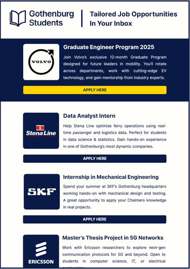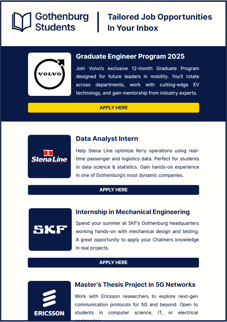 We send curated internships, thesis projects, and jobs from companies looking for Chalmers talent.
